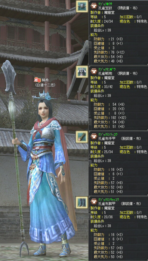 その中で、レベル40到達記念に39布装備一式を揃えた、ってのがあってですね、長安宮城前にてSS取ってた記事があったんですが、実はあの39装備、未だに持ってたりしますw